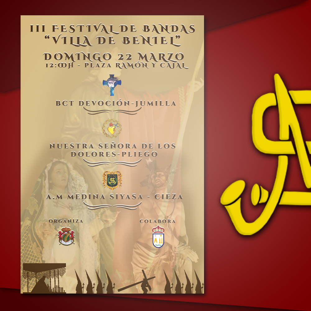 El próximo domingo, 22 de marzo, a las 12:00, tendrá lugar el III Festival de bandas «Villa de Beniel», en la Plaza Ramón y Cajal de esa misma localidad.